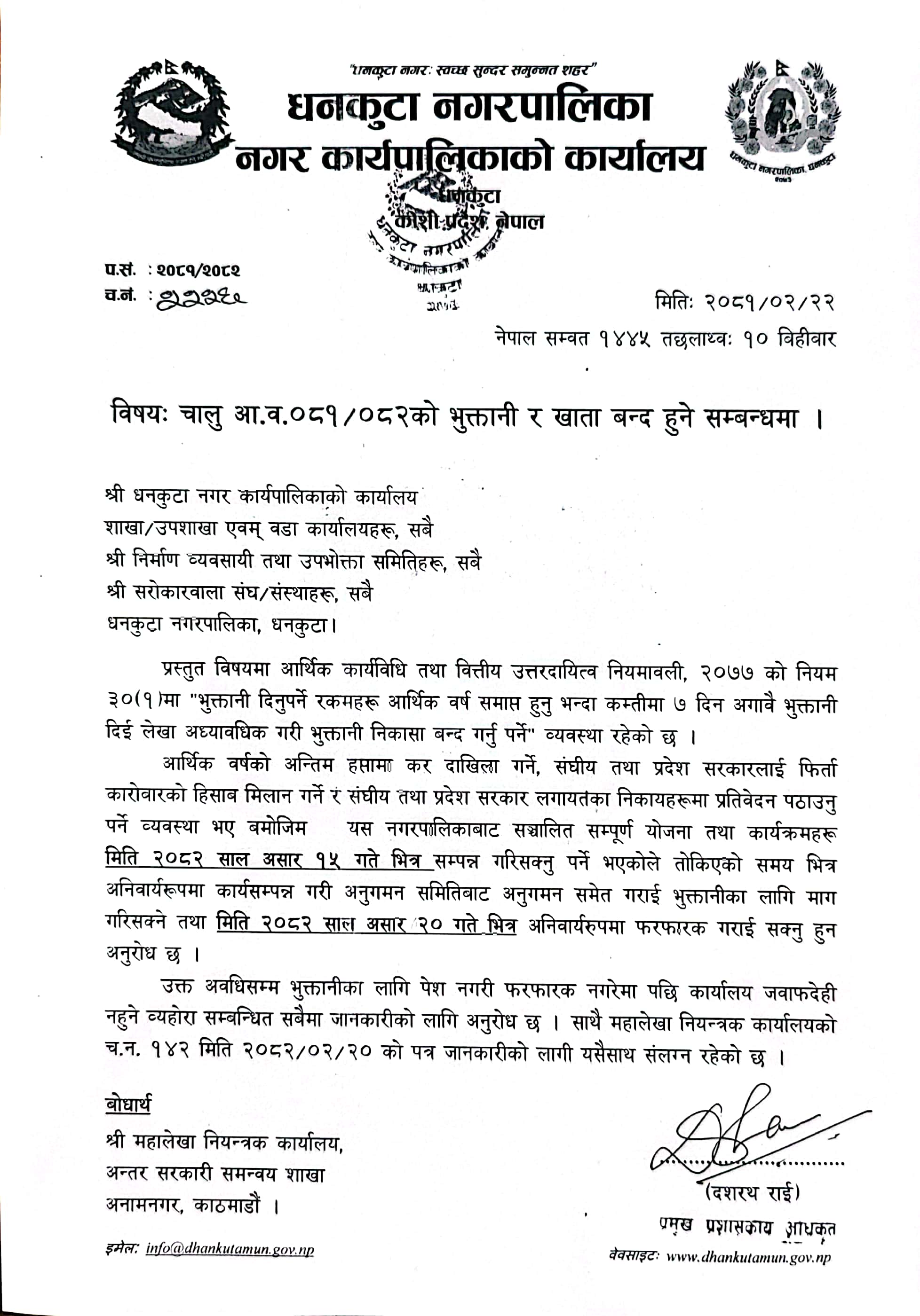 » चालु आ.व. ०८१/०८२ को भुक्तानी र खाता बन्द हुने सम्बन्धमा ।