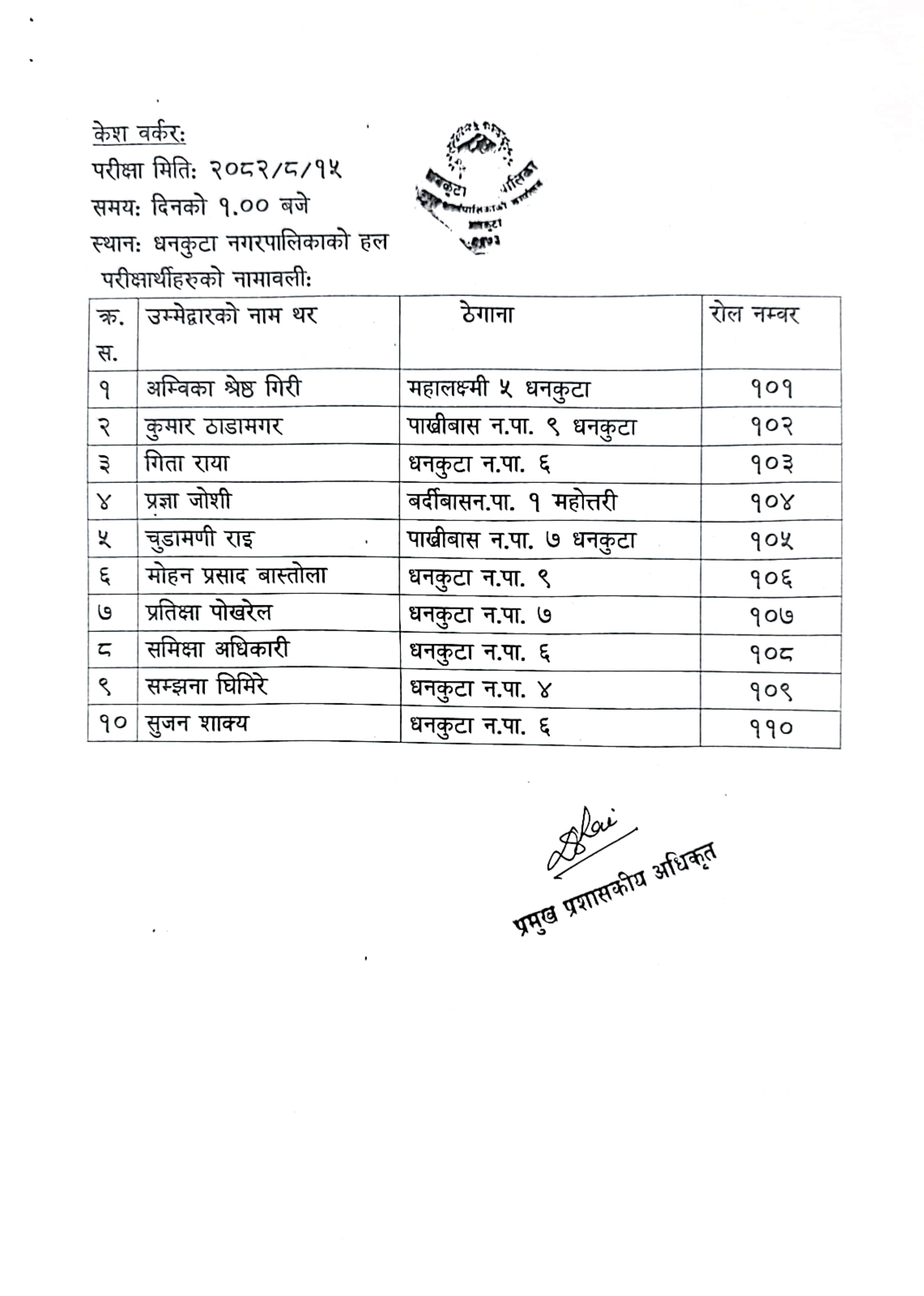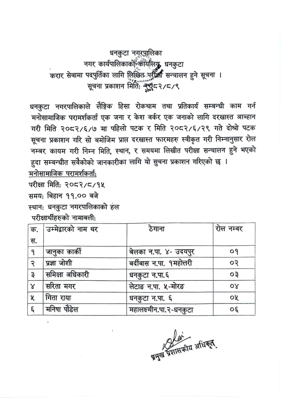मनोसामाजिक परामर्शकर्ता तथा केश वर्कर पदपुर्तिका लागि लिखित परीक्षा सञ्चालन हुने सूचना । सूचना प्रकाशन मितिः २०८२/०८/०९