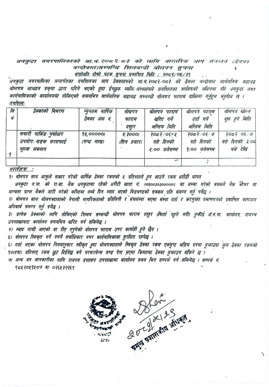 Home » धनकुटा नगरपालिकाको आ.व. २०८२/०८३ को लागि आन्तरिक आय संकलन (ठेक्का बन्दोवस्त) सम्बन्धि शिलबन्दी बोलपत्र सूचना । संशोधित दोश्रो पटक पूचना प्रकाशित मितिः २०८२/०५/२९ ।