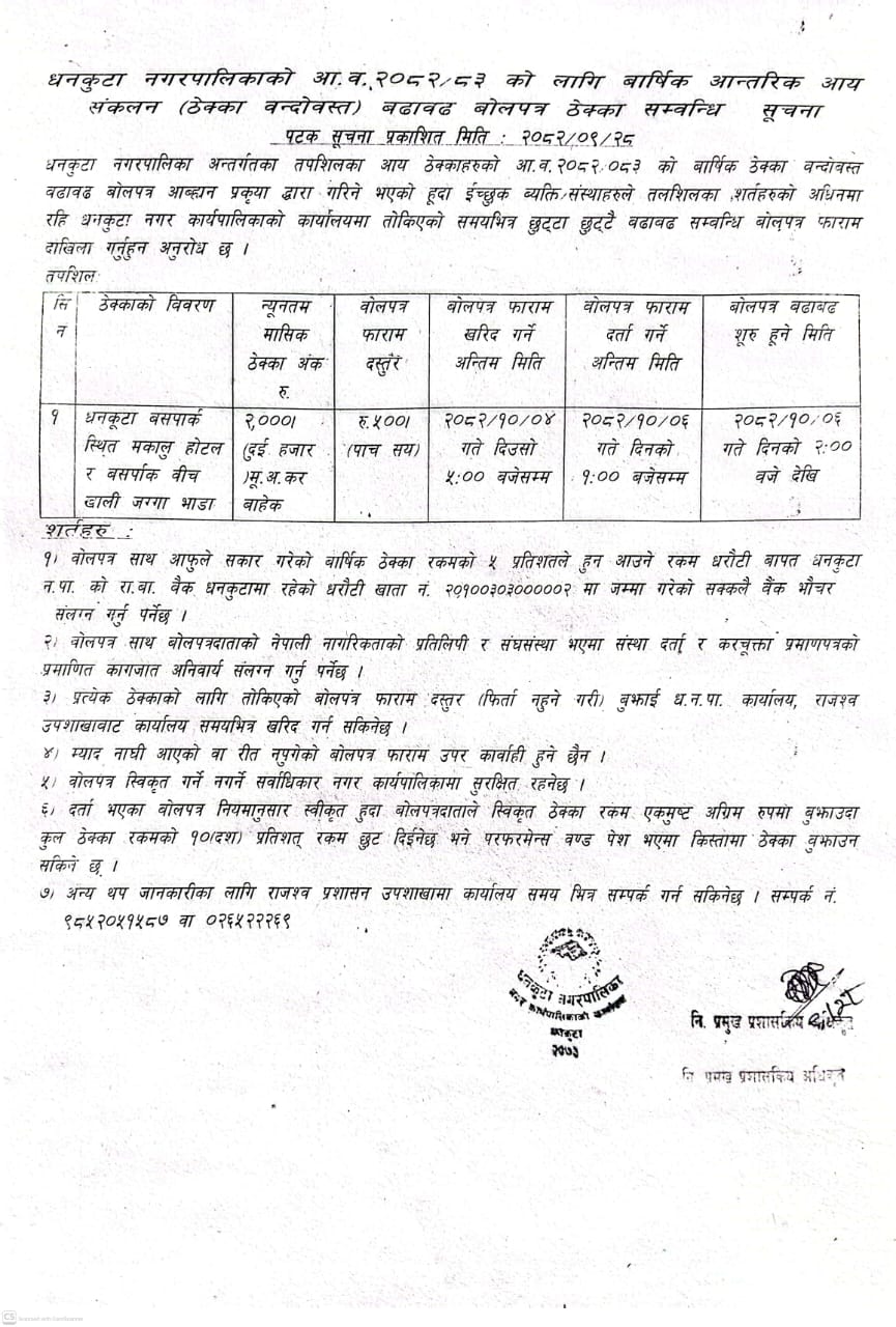 » धनकुटा नगरपालिकाको आ.व. २०८२/८३ को लागि वार्षिक आन्तरिक आय संकलन (ठेक्का बन्दोव्त) बढाबढ बोलपत्र ठेक्का सम्बन्धि सूचना । मितिः २०८२/०९/२८
